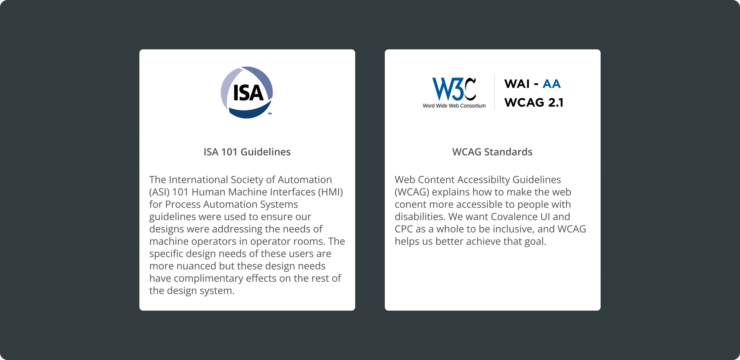Our applications will serve a diverse group of users throughout CP Chem’s operations, including business executives, field engineers, and control room attendants. To ensure the Covalence UI design system is usable and accessible for everyone, we adopted proven design guidelines tailored to specific user needs. Notably, we leveraged the ISA 101 Human Machine Interfaces (HMI) for Process Automation System guidelines to align our control room designs with industry standards, delivering a consistent and reliable user experience across all areas.