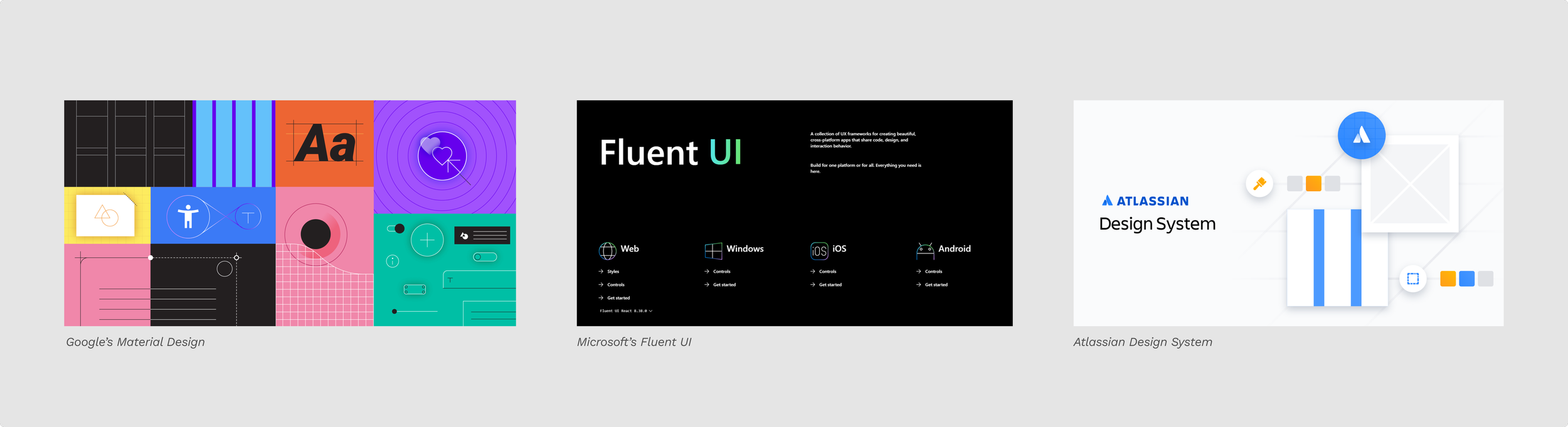 Typically, I would start a design system by conducting an audit of visual attributes (such as spacing, color, and typography) and UI elements (such as buttons, cards, badges, and modals). However, since we were building the system from the ground up, we skipped this step and went directly into defining the visual language. The first step in that process was to examine well-established design systems and learn from their design decisions. While we drew inspiration from Google's Material Design and Atlassian's Design System, the client preferred using Fluent UI as the primary resource due to our applications’ tech stack being primarily Microsoft products.